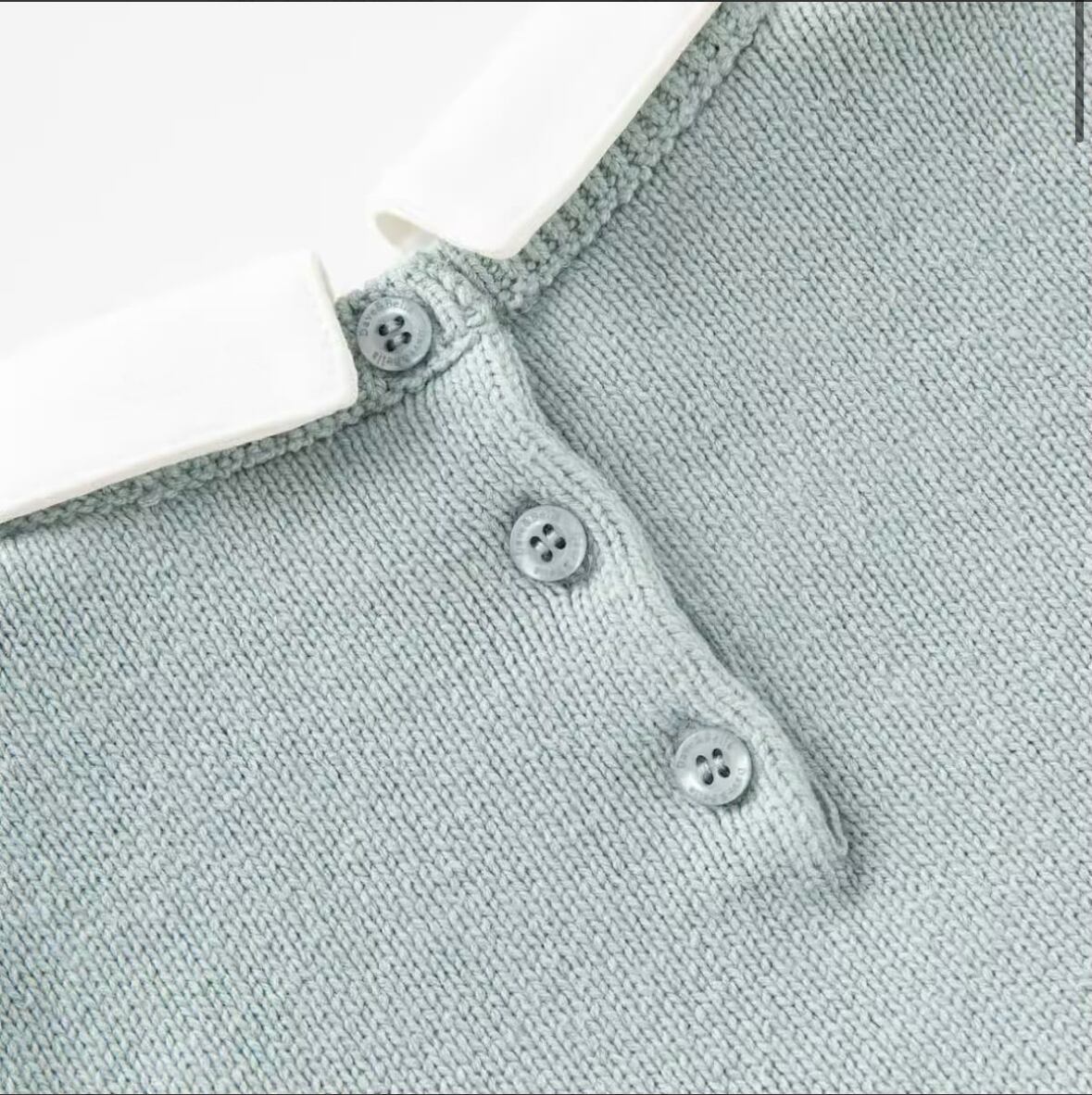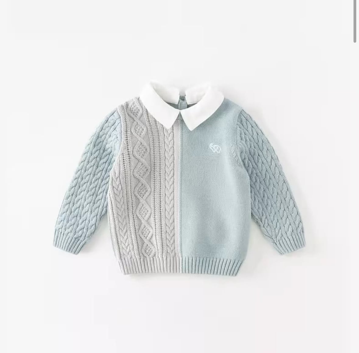 ■素材:60%コットン、40%アクリル、襟100%コットン ■色:ライトブルー×グレー ■サイズ: 【80】着丈34 バスト31.5 袖丈27 肩幅23 【90】着丈36.5 バスト33 袖丈30 肩幅24 【100】着丈39.5 バスト34.5 袖丈33 肩幅25 【110】着丈42.5 バスト36.5 袖丈36 肩幅26 【120】着丈45.5 バスト38.5 袖丈40 肩幅27.5 ※130サイズ〜はお問い合わせ下さい